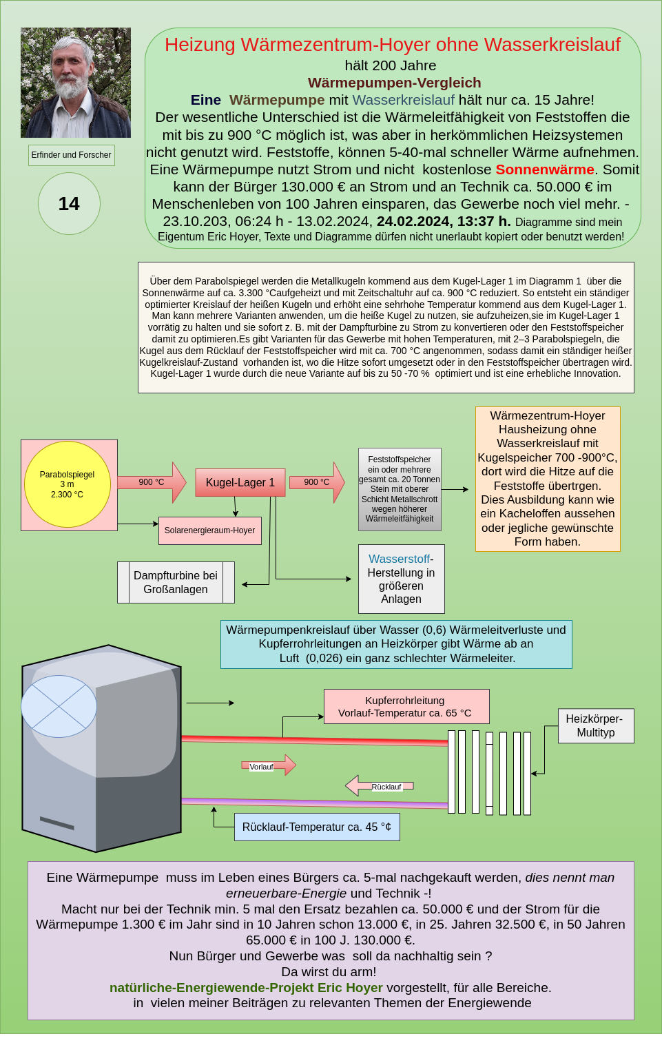 7. **Wärmepumpen und Nachhaltigkeit:** Sie betonen die Nachteile von Wärmepumpen in Bezug auf ihren Stromverbrauch und ihre begrenzte Lebensdauer im Vergleich zu Ihren vorgeschlagenen Lösungen.